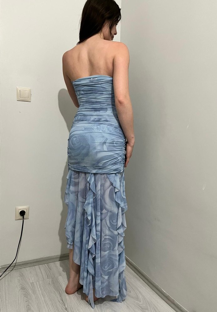 Mavi tie-dye desenli, straplez ve drapeli uzun elbise. İnce kesimi ve çağdaş tarzı ile parti için uygun.