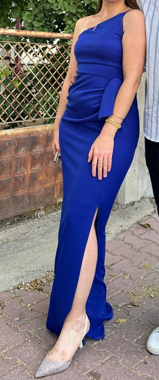 Mavi Drapeli Uzun Tek Omuz Abiye