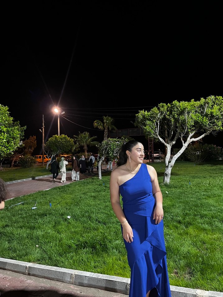 Tek omuz belden drapeli saks mavisi abiye ile özel gecelerinize eşlik edecek çok zarif bir elbise