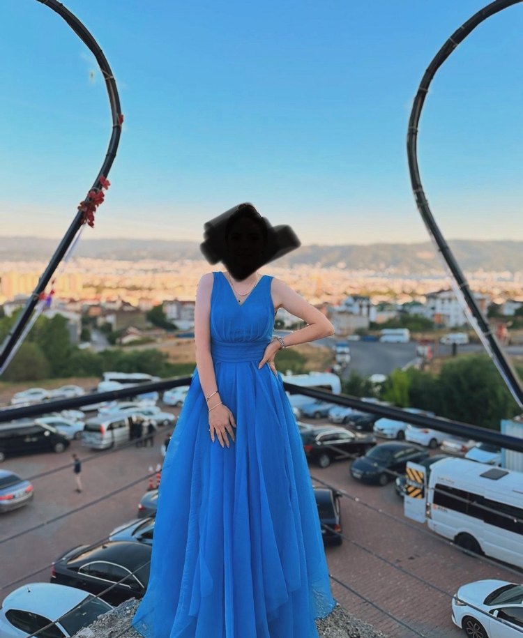 Mavi Drapeli Uzun V Yaka Kadın Abiye
