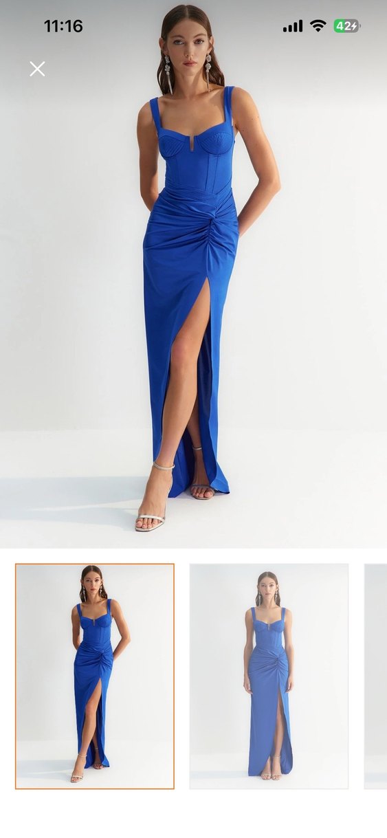 Drapeli tasarımı, V yakası ve ince askılarıyla fit kesim uzun elbise. İpeksi kumaştan, minimal ve çağdaş parti şıklığı sunar. Açık mavi renk ve yırtmaç cesur duruş katıyor.