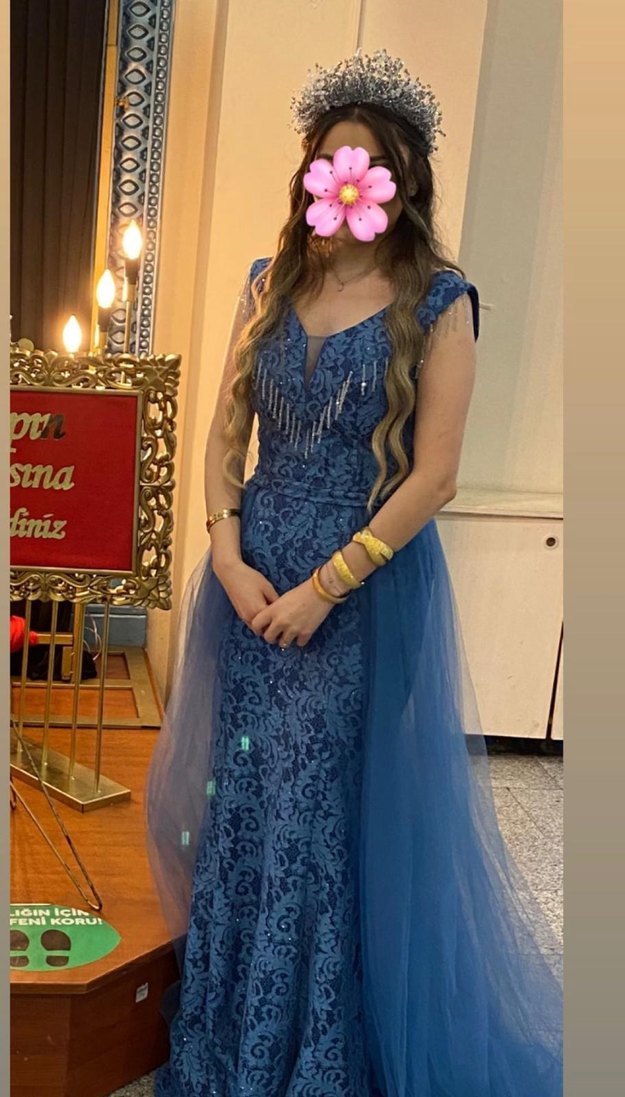 Mavi Drapeli V Yaka Bohem Uzun Nişan Elbisesi