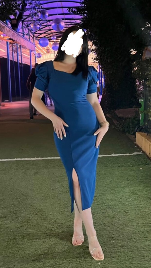 V yakalı, fitted kesim midi elbise. Pürüzsüz sentetik kumaştan, koyu mavi renkte, ön yırtmaç detaylıdır. Esnek olduğundan dolayı M bedene de uygundur,Defosu yok