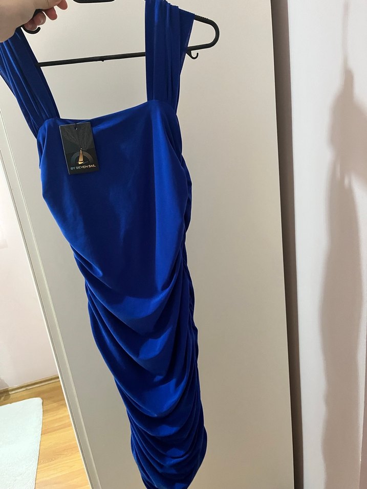 Bu mavi elbise, drapeli tasarımı ve V yakası ile dikkat çeker. Kolsuz ve midi boyda olup, şık parti kıyafeti olarak uygundur. etiketli hiç kullanılmadı