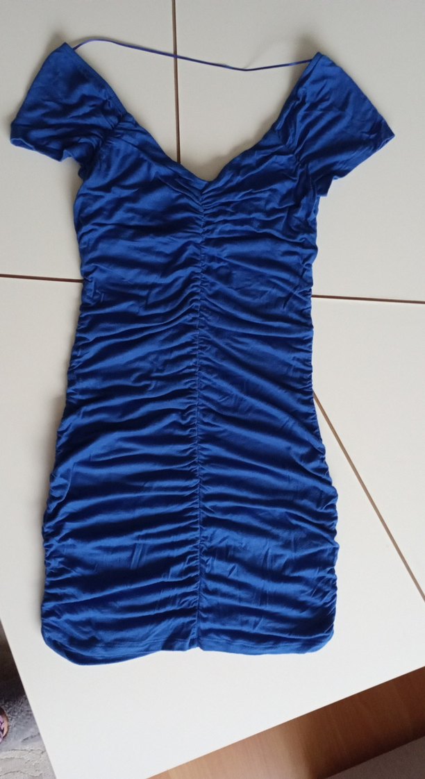 Mavi renkli, v yaka ve kısa kollu, drapeli tasarıma sahip, fitted kesim midi elbise. Günlük sokak stiline uygun.