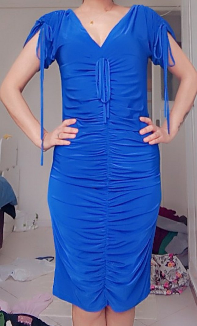 Mavi renkli, drapeli tasarıma sahip, V yakalı ve askılı kollu, beden oturan midi elbise.