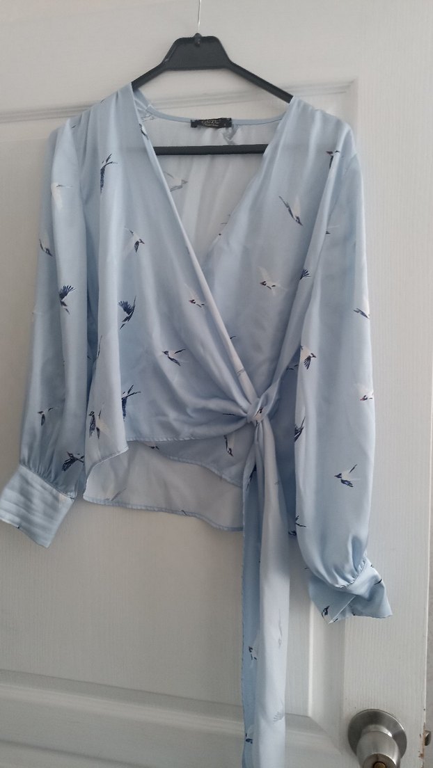 Pastel mavi tonlu, uzun kollu, hafif dökümlü, V yakalı ve drapeli kadın bluz. Baskılı deseniyle günlük sokak stiline uygun.