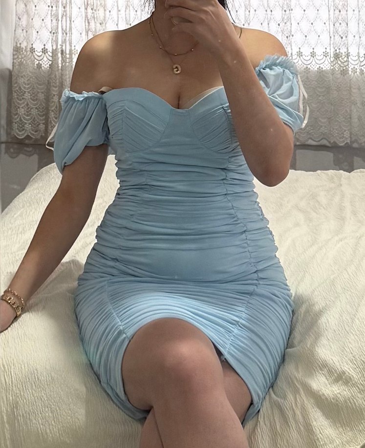 Mavi Drapeli V Yakalı Mini Elbise tül