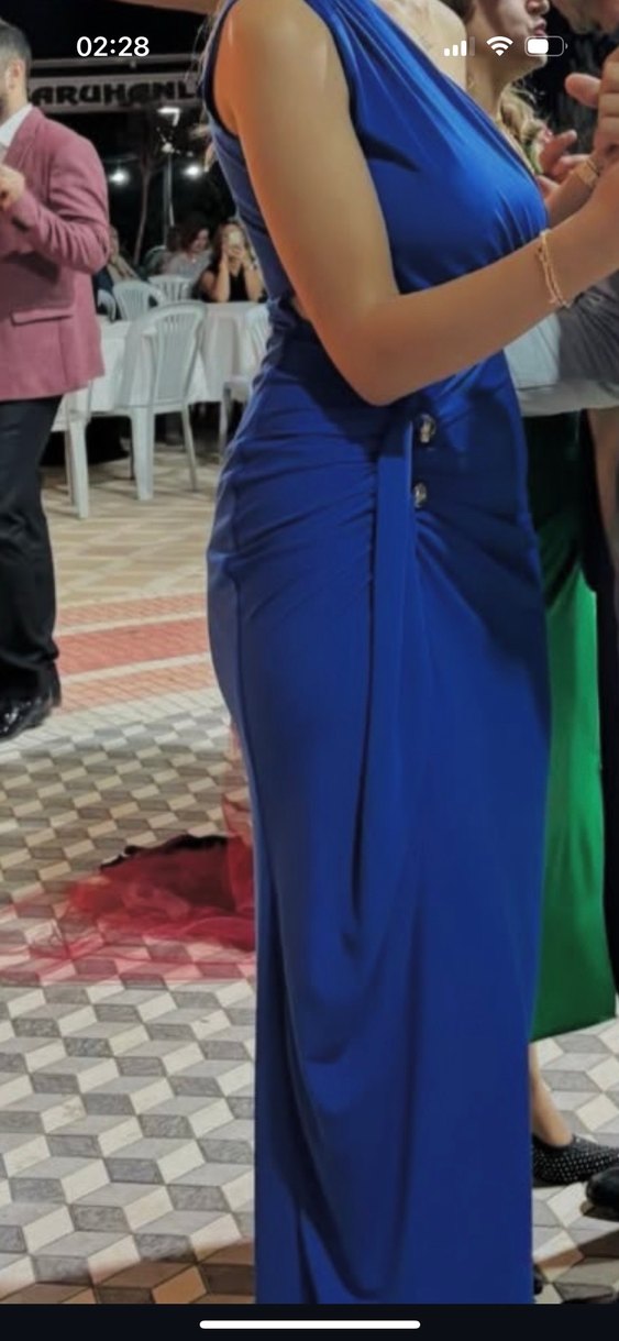 Drapeli tasarımı ve kolsuz V yakasıyla mavi, uzun ve vücuda oturan abiye elbise, şık düğünler için uygundur.