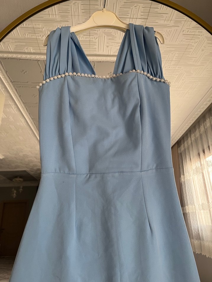 Kolsuz, uzun boylu ve drapeli tasarıma sahip bu abiye elbise, V yakalı ve inci detaylıdır. Pastel mavi rengi ve klasik kesimiyle düğünler için uygundur.