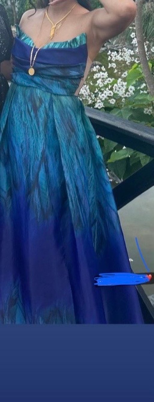Uzun, kolsuz mavi tonlarında tie-dye desenli, drapeli kadın elbisesidir. V yakalı ve bol kesimdir, bohem ve avangart tarzda, düğünlere uygundur. (Ürün çok güzel tek bir kere kullanıldı yenildiği zaman kiloyla alakalı hiçbir kusuru göstermiyor fiziği çok güzel gösteriyor)