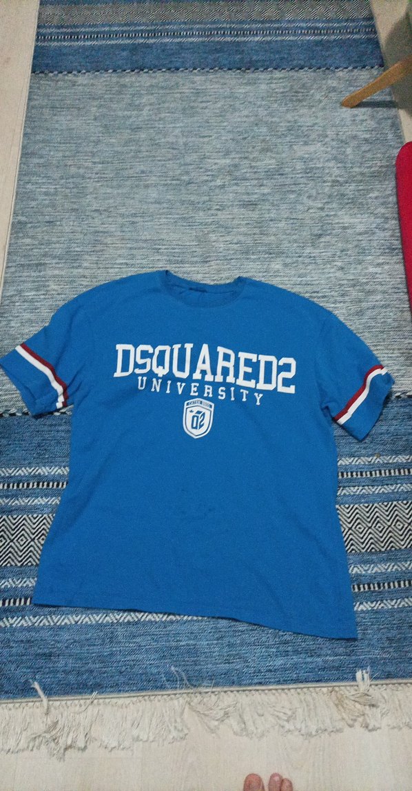 Mavi renkli, denim kumaştan üretilmiş DSQUARED2 baskılı erkek tişört. Kısa kollu, yuvarlak yaka ve bol kesimdir. Renkli baskılar dikkat çekicidir.
