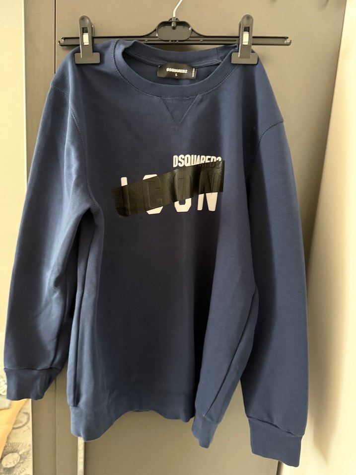 Mavi DSQUARED2 baskılı sweatshirt, uzun kollu ve yuvarlak yaka tasarıma sahiptir. Pamuklu ve bol kesim olan bu parça, rahat ve şık bir görünüm sunar. Günlük kullanım için uygundur.