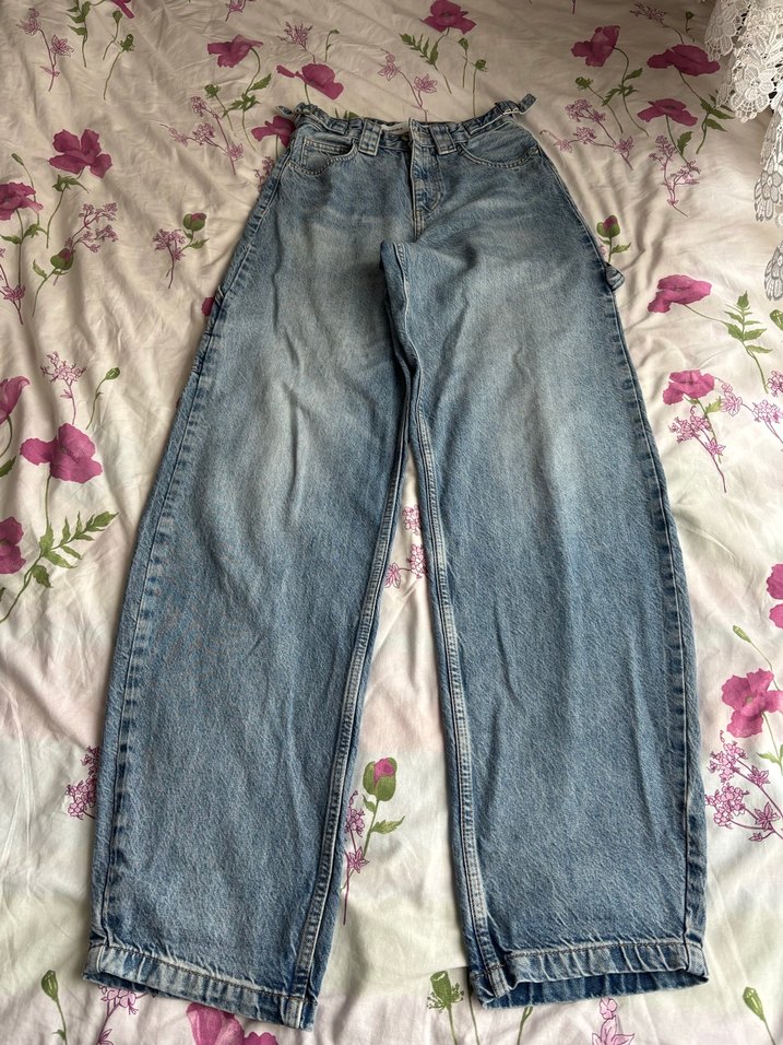 Mavi denimden yapılmış, düğmeli ve yan bağcıklı geniş paça kot pantolon. Günlük kullanıma uygun, rahat ve sokak stiliyle uyumlu.