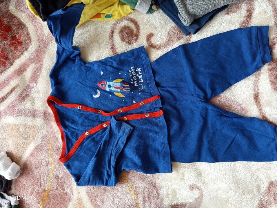 Uzun kollu, düğmeli ve renkli nakış detaylı mavi bebek erkek takımı. Yumuşak ve sıcak kumaştan üretilmiştir, rahat kullanım sağlar.