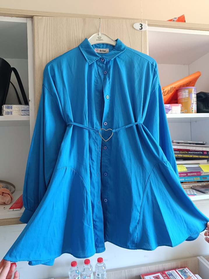 L beden.Düğmeli, yakalı, uzun kollu mavi gömlek, bol kesim ve kalp şeklinde kemer detayıyla bohem tarzda günlük kullanım için uygundur.