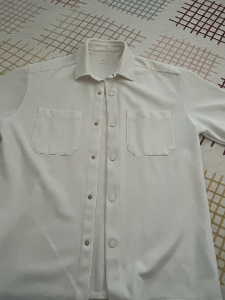 Düğmeli ön kısmı ve iki göğüs cebi bulunan, kısa kollu, regular fit beyaz erkek gömleği. Hafif sentetik kumaştan, gündelik sokak stili için uygundur.