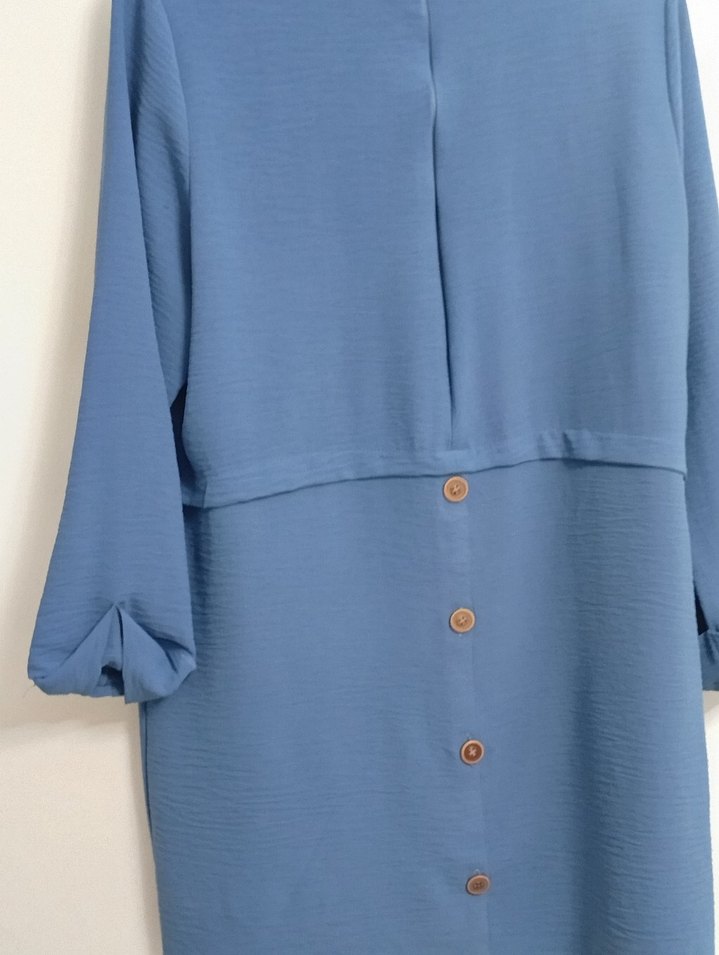 Mavi renkte, düğmeli ve uzun kollu hamile bluzu. Bol kesim, uzun boy ve yakasında kesik detay bulunur. Günlük kullanım için uygun, yumuşak sentetik kumaştan üretilmiştir. iki kere giydi fiyatlar sondur