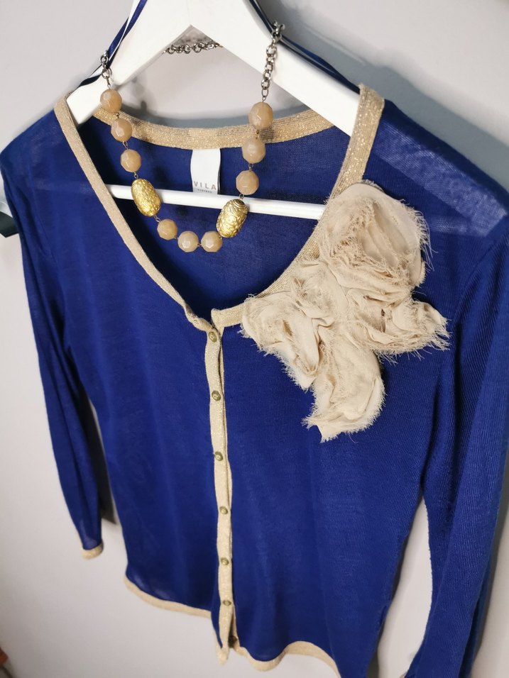 Mavi, parlak örme kumaşlı, yuvarlak yakalı ve düğmeli kadın hırkası. Uzun kollu, bol kesim, normal midi boyda. Bej detaylı bohem tarz, günlük kullanıma uygun.