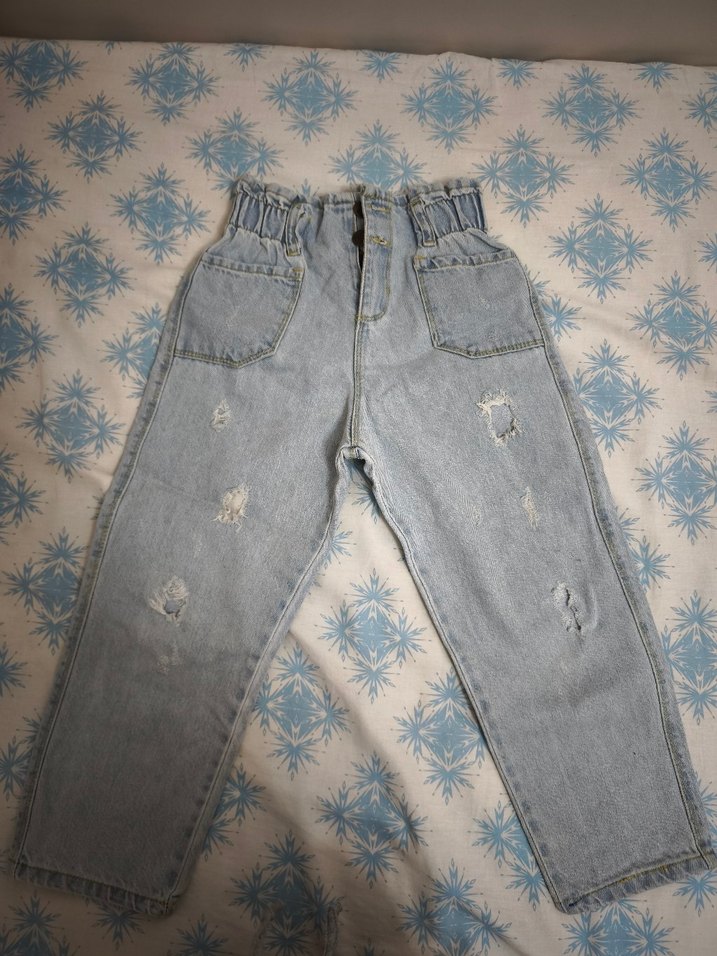 Düğmeli ve yırtık detaylı, bol kesim mavi kot pantolon. Trendy günlük sokak stili için uygundur.