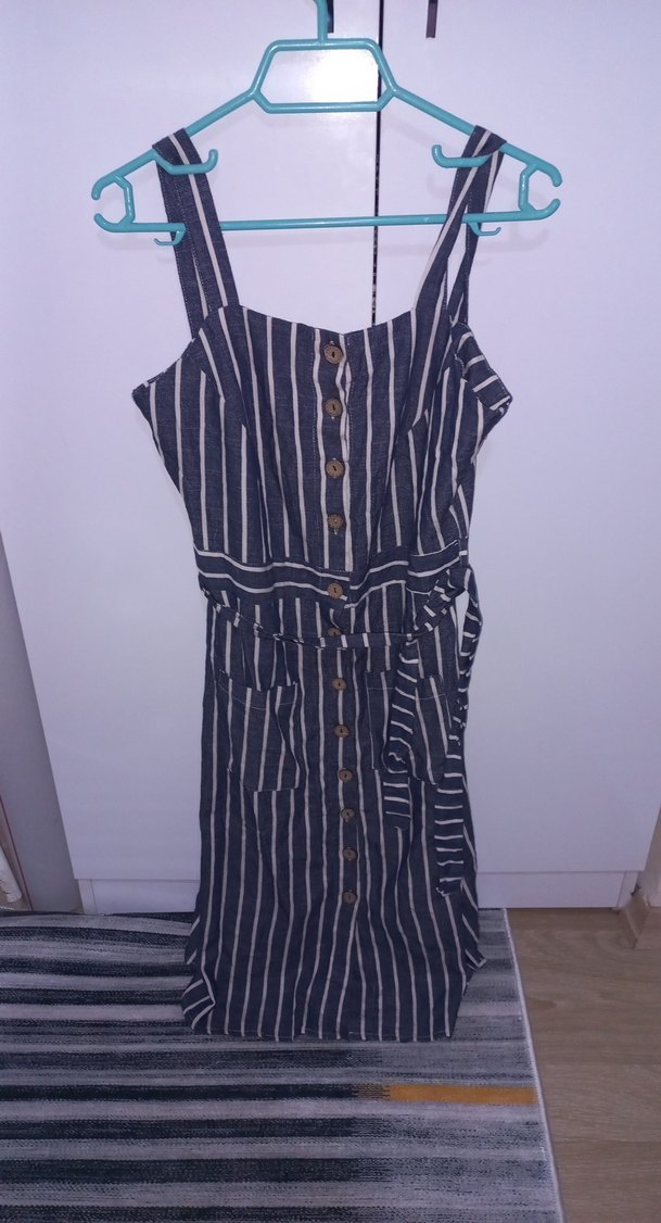 Düğmeli ve ince askılı, çizgili midi uzunlukta lacivert kadın elbise. Belden kuşaklı, fit kesim ve günlük kullanıma uygun. Kalıbı dardır. 42 yazıyor ama 40 38 bedenlere olur.