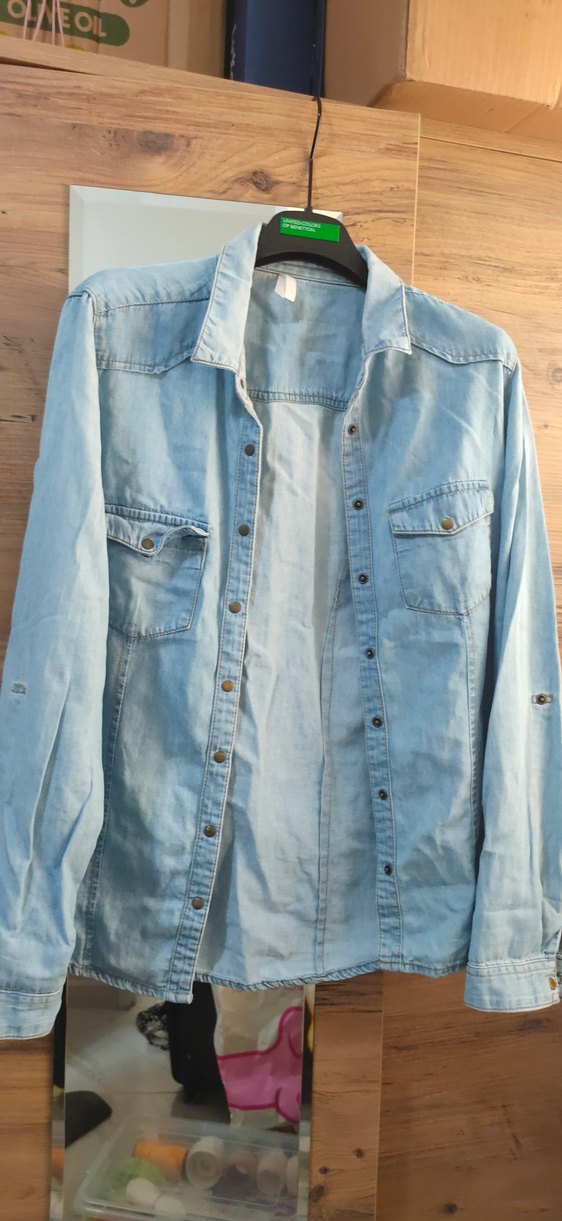 Pastel mavi renkli, düğmeli, uzun kollu denim gömlek. Notched lapel yakalı, bol kesim ve normal uzunlukta, günlük rahat kullanım için uygun.