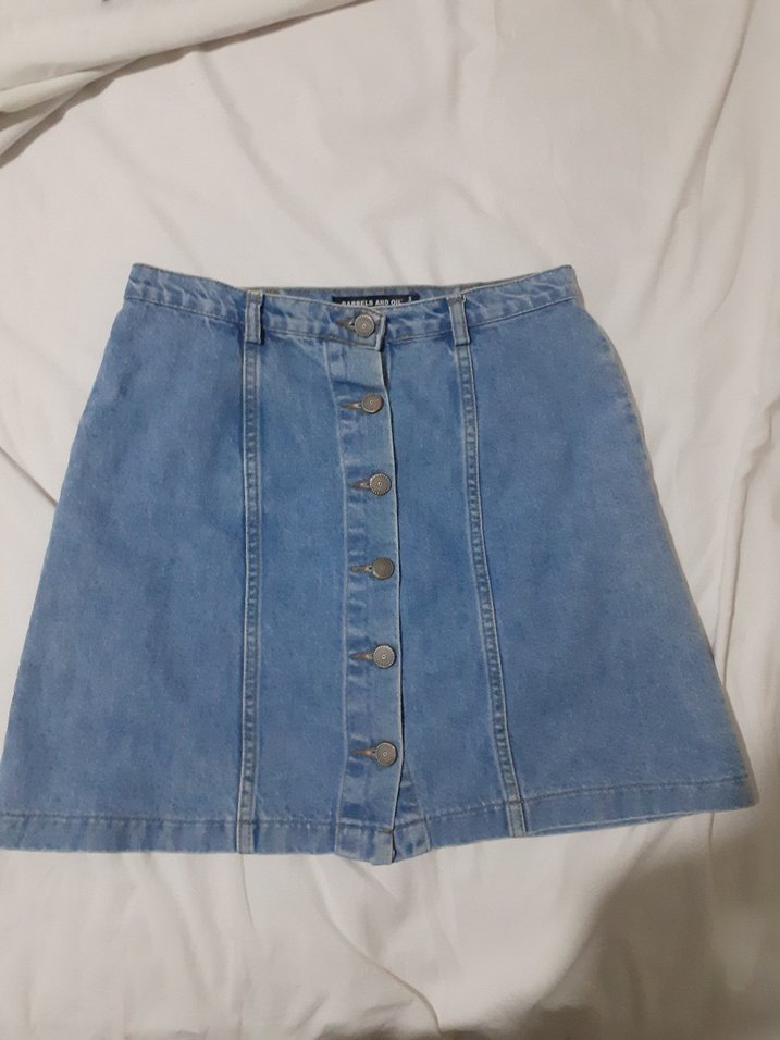 Pastel mavi renkli, düğmeli , bol kesim denim mini etek. Sokak tarzına uygun sade ve desensiz model.