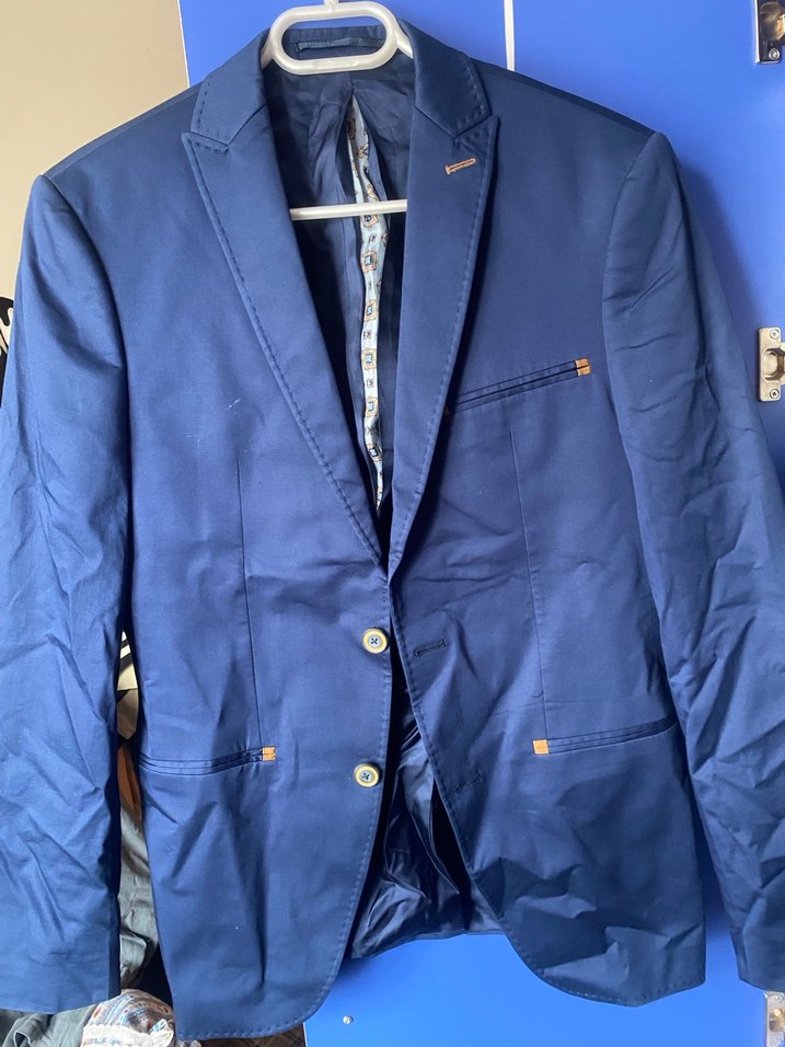 Düğmeli, mavi parlak renkte erkek ceket. Normal boy, regular fit ve uzun kolludur. Ofis için uygundur.