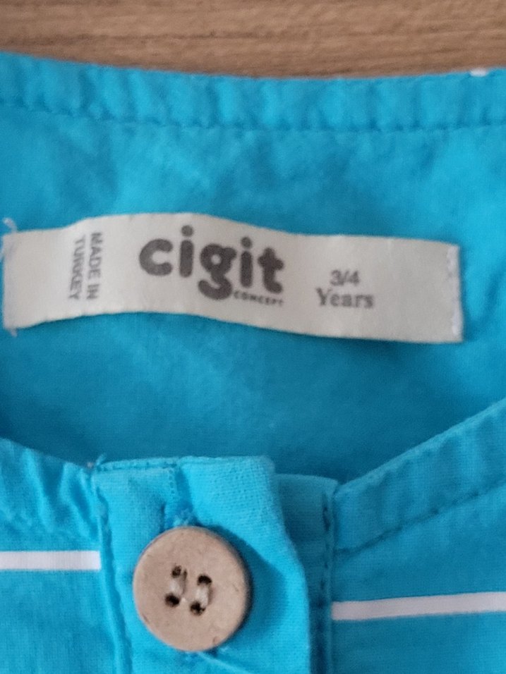 Parlak mavi pamuklu, kısa kollu, düğmeli ve baskılı erkek çocuk gömleği. Rahat kesim ve yakası açık model. Cigit markası, 3-4 yaş için uygun.