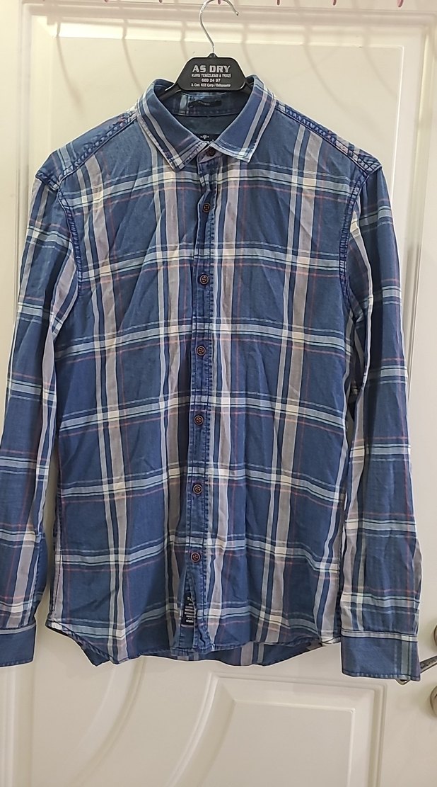 Düğmeli, uzun kollu, regular fit erkek denim gömlek. Mavi ve gri tonlarda, bağlama desenli, günlük kullanıma uygun.