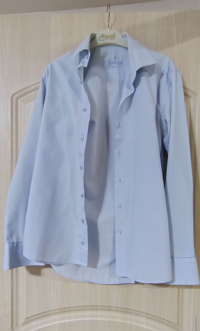 Mavi renkte, saten kumaştan, uzun kollu, düğmeli ve dar kesim erkek gömleği. Ofis kullanımı için uygundur.