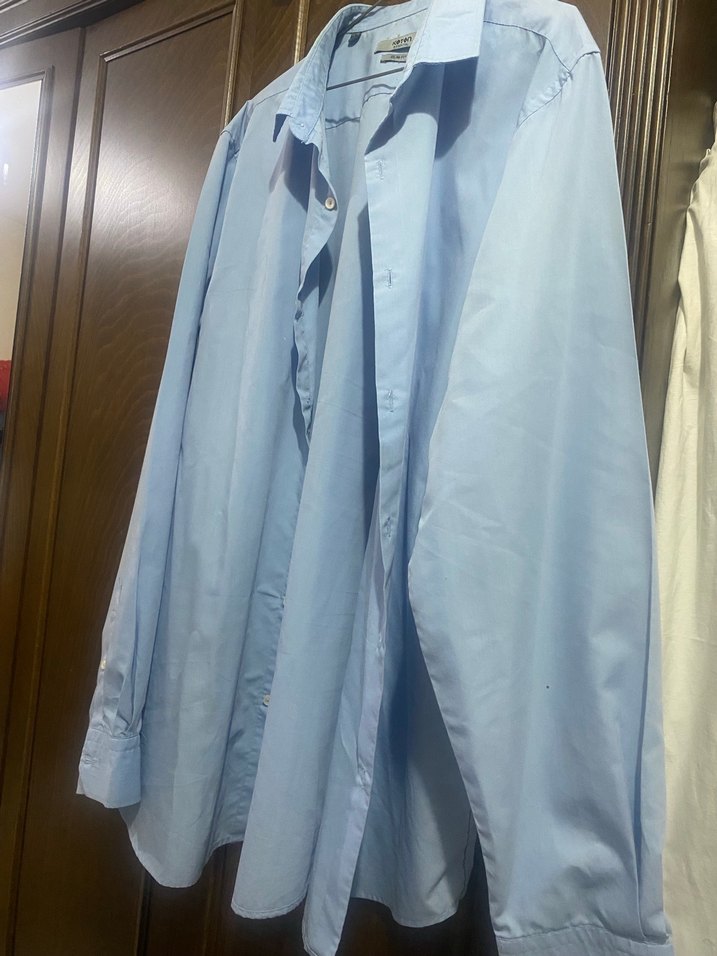 Düğmeli, mavi pastel renkte, ipeksi kumaştan yapılmış erkek gömlek. Normal uzunlukta, uzun kollu ve notched yakalı, ofis için uygun normcore tarzda.