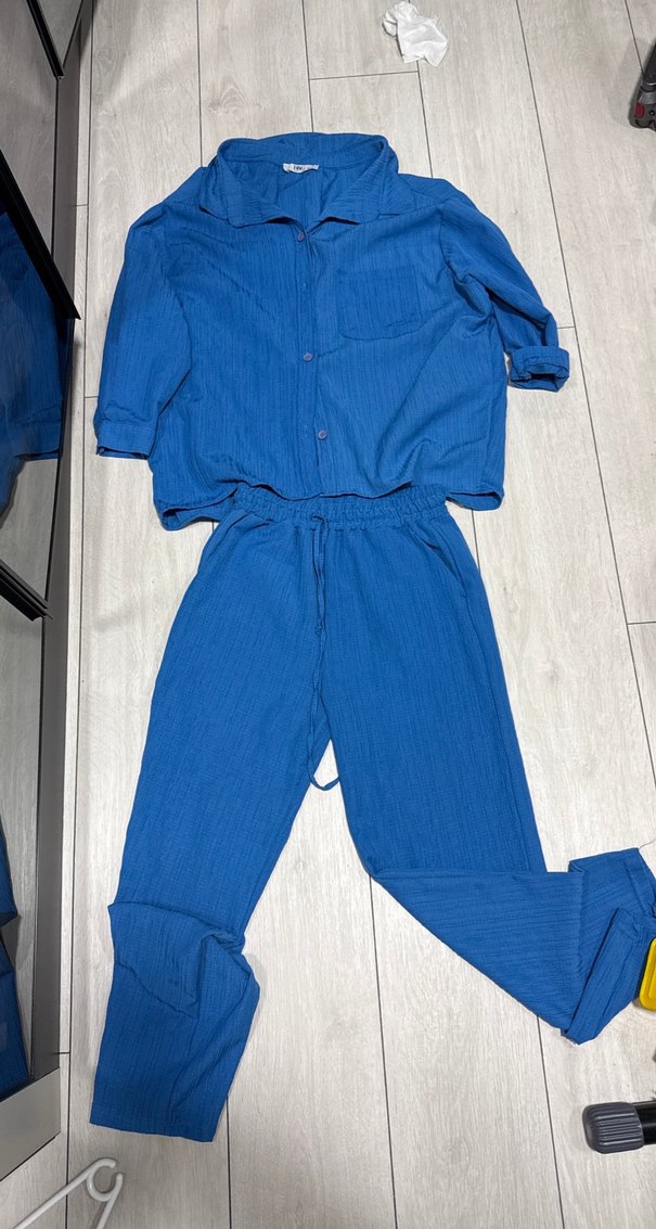 Pastel mavi renkli, düğmeli, kısa kollu, notched yaka ve bol kesim erkek midi pijama takımı.