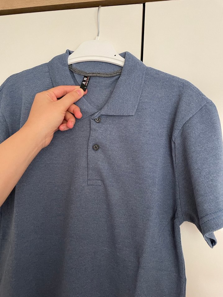 Mavi denim kumaştan, düğmeli ve kısa kollu, bol kesim polo tişört. Günlük sokak stili için uygundur. L beden yazıyor M beden için uygundur Marka temsilidir