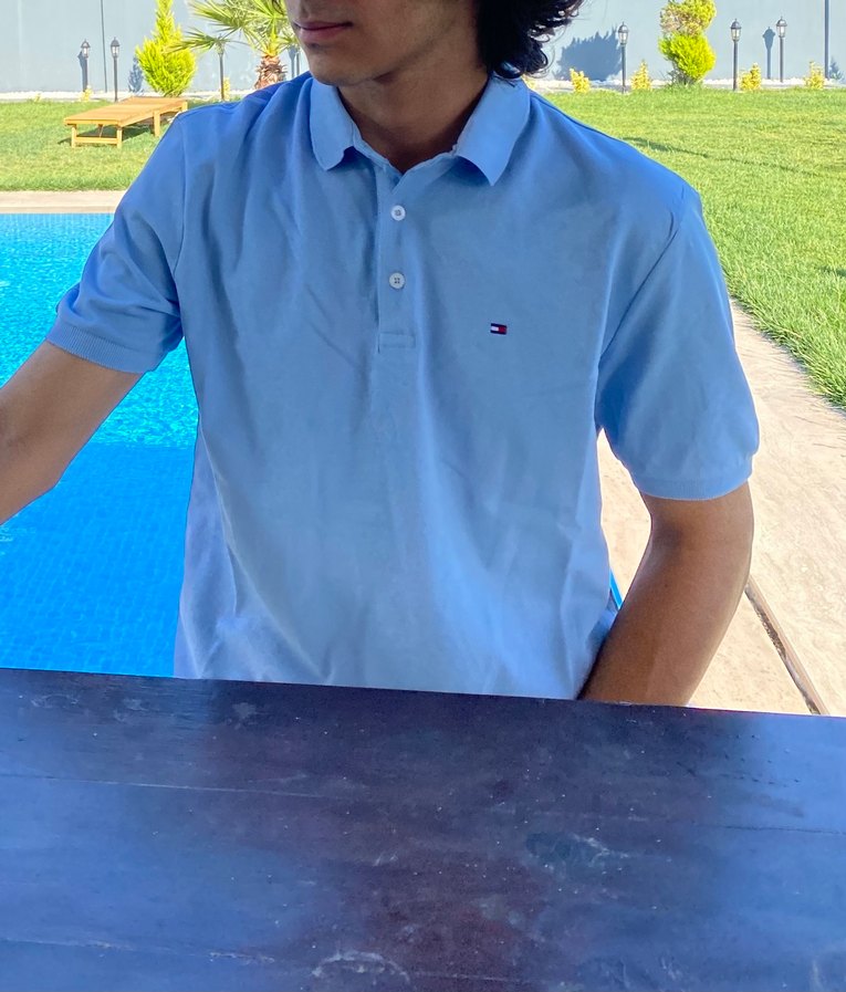 Açık mavi renk, kısa kollu, yakalı ve düğmeli ön kısmı olan erkek polo tişörtü, rahat kesim ve günlük dış mekan kullanımı için uygundur.