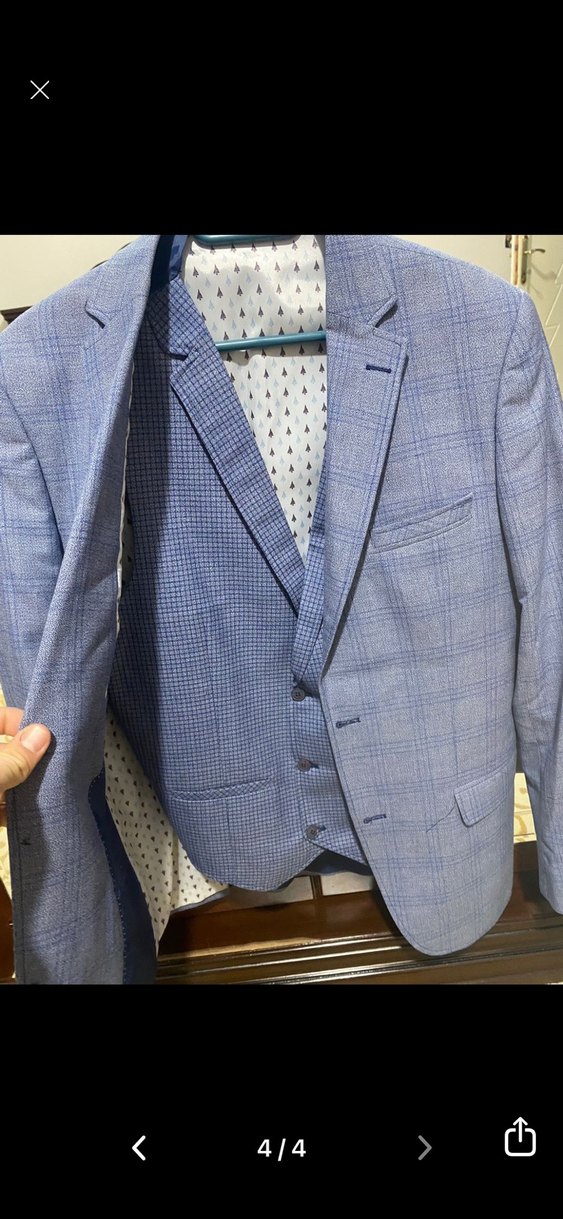 Mavi ve gri kare desenli, düğmeli, notched lapel yakalı erkek takım elbisesi. Uzun kollu ve midi boyda, ofis için uygun. 1 kere tek giyilmiştir 6 yıl önce en son