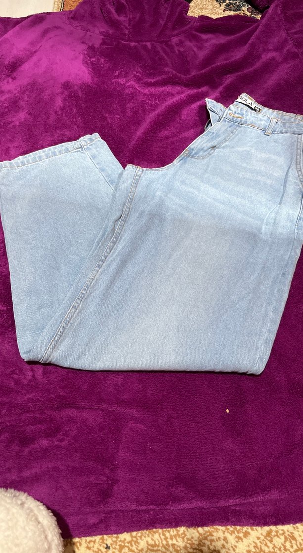 Pastel mavi renkli, düğmeli, gevşek kesim midi uzunlukta kadın kot pantolon. Klasik denim kumaştan, günlük sokak stili için uygundur.
