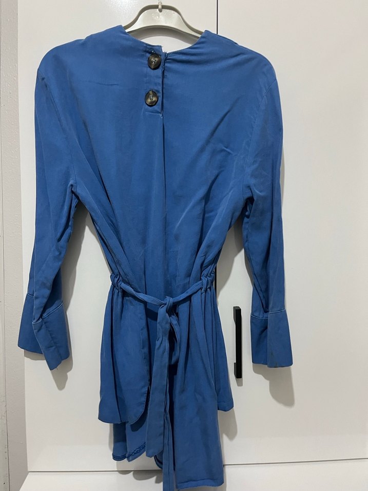 Uzun kollu, düğmeli ve notlu yakalı mavi hamile bluzu. İpeksi kumaştan, bol kesim ve belde bağcık detaylıdır. Günlük rahat şıklık için uygundur.