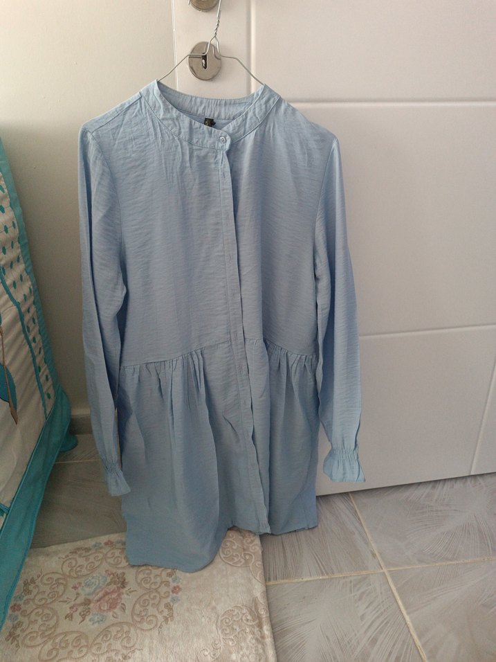 Mavi, düğmeli ve uzun kollu hamile tunik. Rahat kesimi ve yakalı tasarımıyla günlük kullanıma uygun, yumuşak keten kumaştan üretilmiştir. iki yerde sarı leke var ama çok belli olmuyor fotoğraf da belirttim