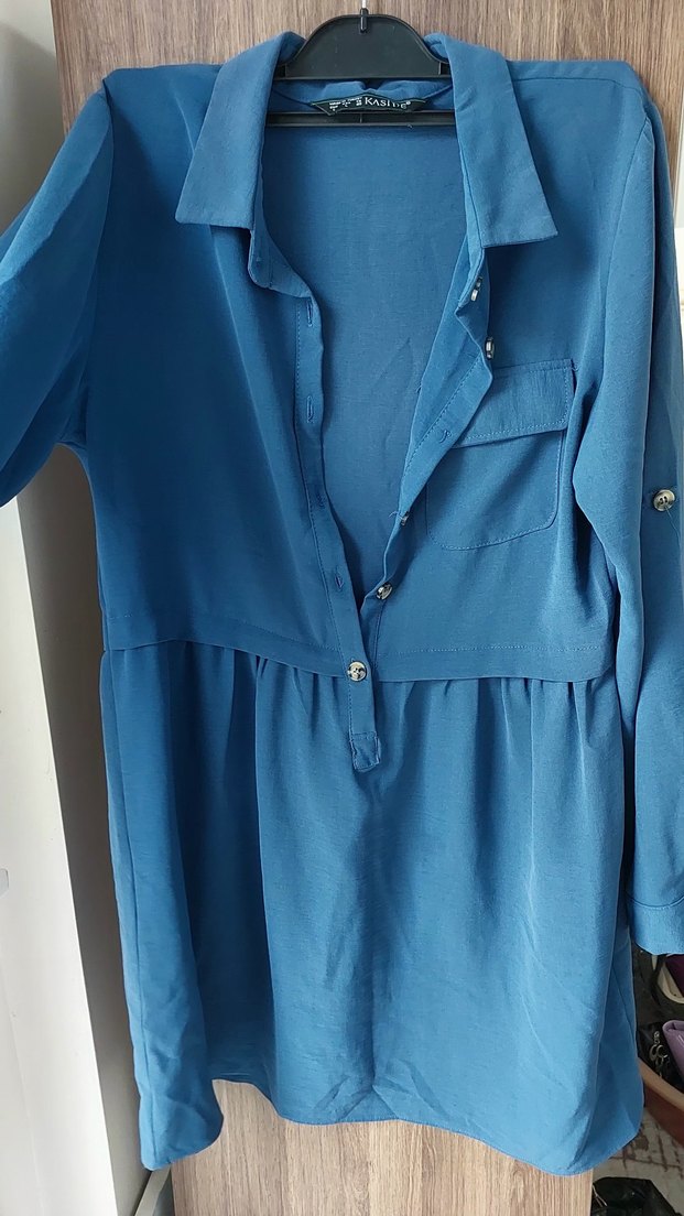 Parlak mavi renkli, notalı yaka ve uzun kollu düğmeli hamile tunik. Bol kesim ve midi boyda, günlük kullanıma uygun.