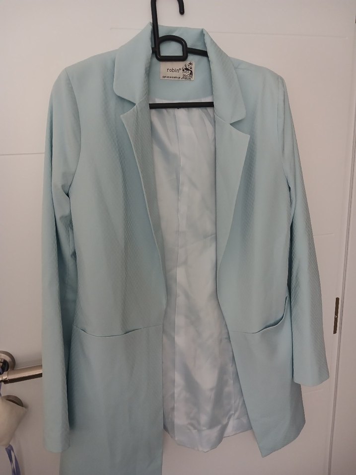 Pastel mavi renkli, düğmeli, normal kesim, uzun kollu ve midi boy kadın blazer ceket. Sentetik kumaştan üretilmiş, iş ortamına uygun şık bir parça.
