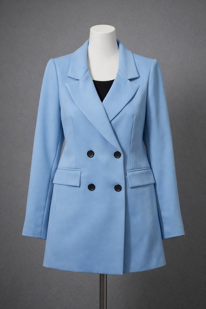 Gök mavi renkte, kesik yaka ve çift düğmeli kadın blazer ceket. Uzun kollu, midi boyda ve düz kesimli, sentetik kumaştan üretilmiştir. Çok az kullanıldı Temiz üründür. günlük veya davetler için de uygundur