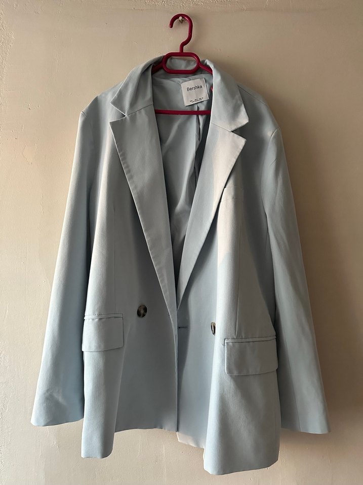 Mavi renkli, düğmeli, uzun kollu kadın blazer ceket. Notlu yaka ve midi boyda, ofis için uygun, düz ve rahat kesim.