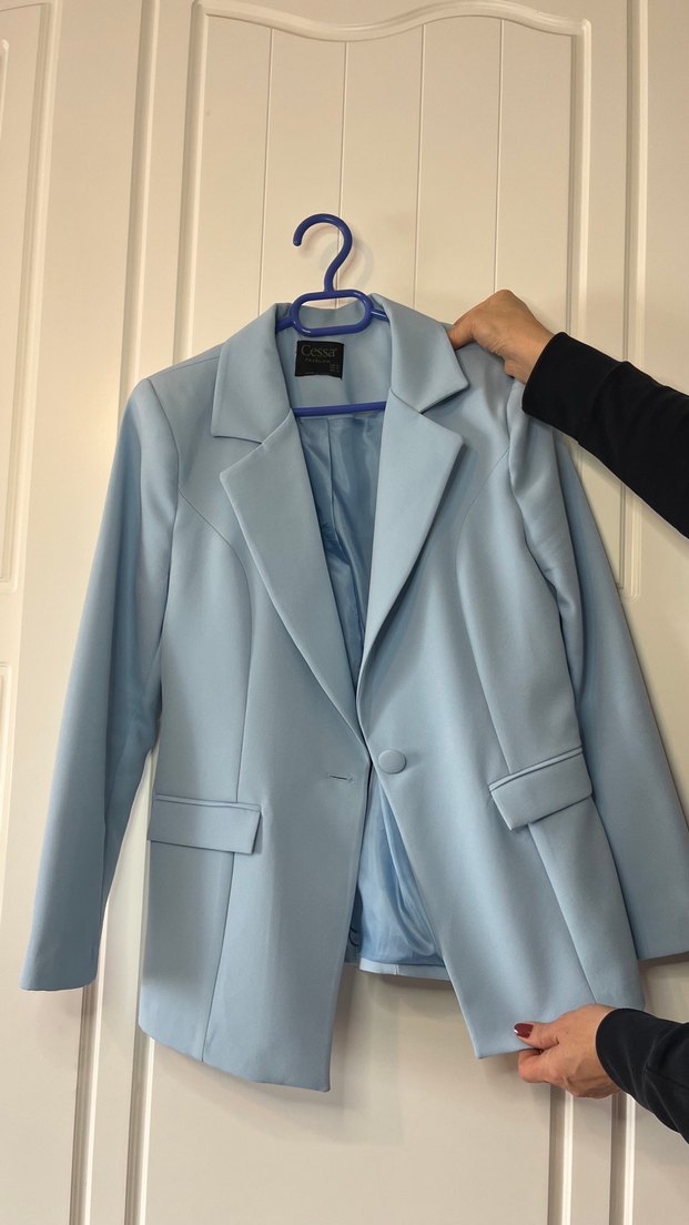 Pastel mavi renkte, düğmeli, uzun kollu, normal boy midi kadın blazer ceket. Düz desensiz, sentetik kumaştan, ofis ve günlük kullanıma uygun.