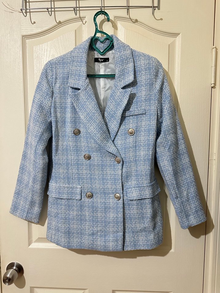 Düğmeli ve kesimli yakalı bu kadın blazer ceket, uzun kollu ve pastel mavi bağlama desenlidir. Ofis için uygun, midi boy ve sentetik kumaştan üretilmiştir.