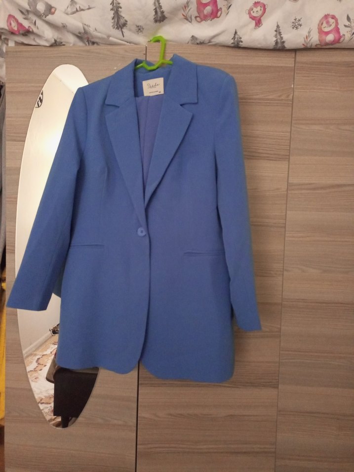 Mavi renkte, düğmeli, uzun kollu, normal boy midi blazer. Düz ve sentetik kumaştan, ofis ve günlük kullanıma uygun.