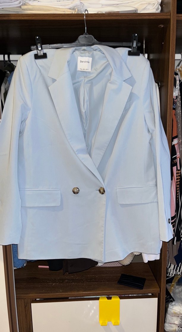 Beyaz renkli, düğmeli ve çıtçıtlı, normal kesim midi uzunlukta kadın blazer ceket. Uzun kollu, düz ve sentetik kumaştan üretilmiştir, iş ve günlük kullanıma uygundur.