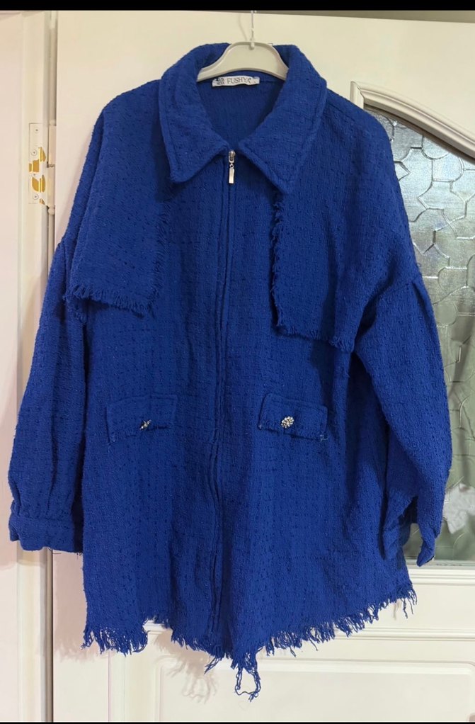 Canlı mavi keten kumaştan, düğmeli, uzun kollu, kısa kesim, salaş kadın ceket. Bohem tarzı için uygun, yaka detaylı ve püsküllü kenarlara sahip.