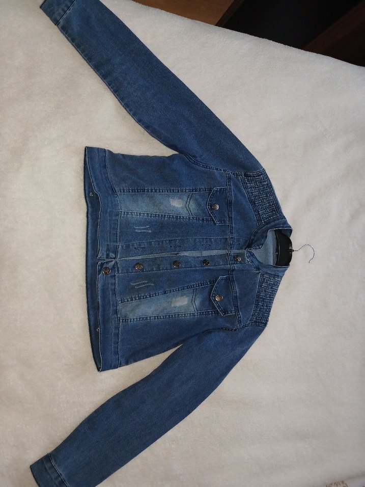 Düğmeli, uzun kollu ve kesimli mavi kadın denim ceket. Notlu yaka ve normal uzunluktadır, günlük sokak stili için uygundur.
