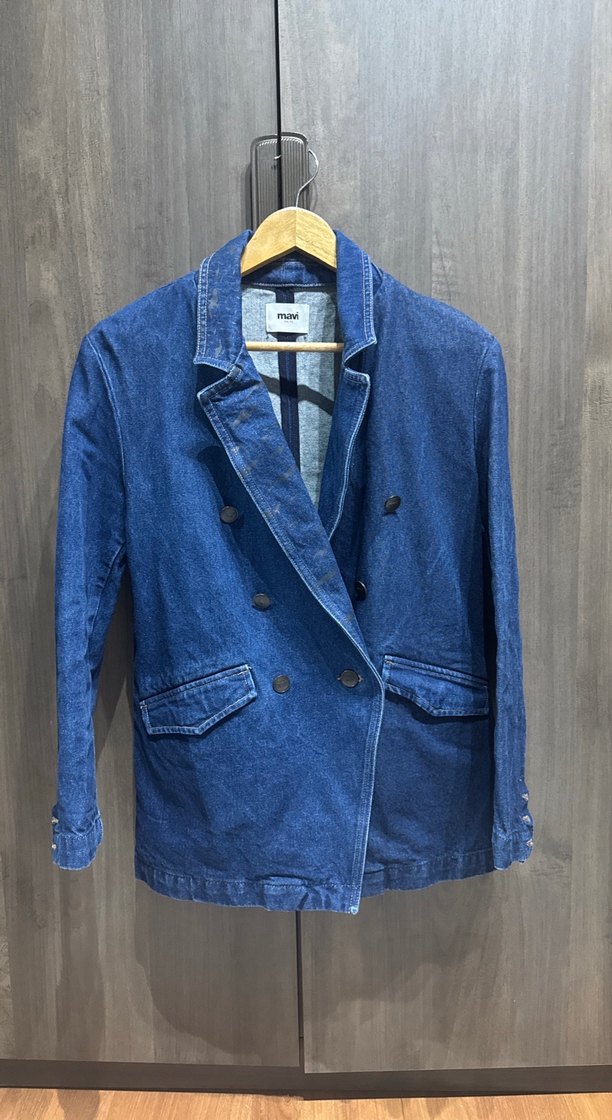 Mavi denim kumaştan, düğmeli ve kesik yaka detaylı kadın ceket. Uzun kollu, normal kesim ve midi boyda, günlük rahat kullanıma uygun.